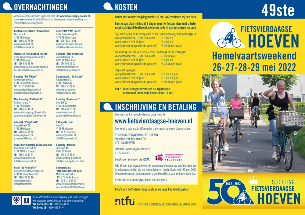 Wat was het stil tijdens het Hemelvaartsweekend 2020 en 2021 op ons Fietsvierdaagse centrum Bovendonk. Maar we mogen weer. En dit jaar bestaat de Stichting Fietsvierdaagse Hoeven 50 jaar. Dus feest.