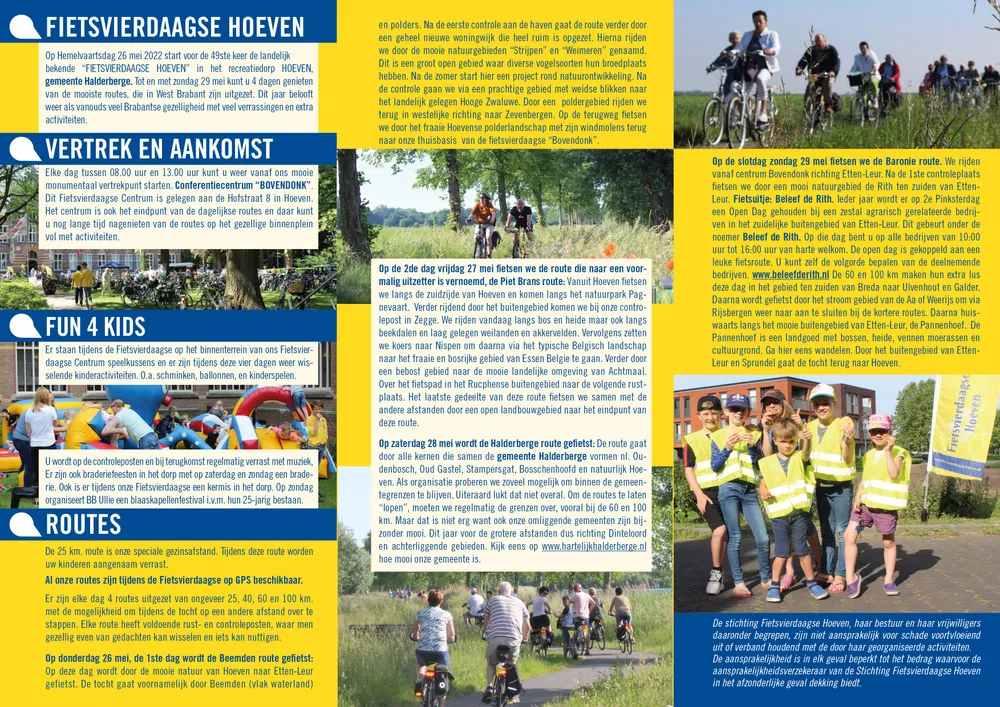 Op Hemelvaartsdag 26 mei 2022 start voor de 49ste keer de landelijk bekende Fietsvierdaagse Hoeven in het recreatiedorp Hoeven, gemeente Halderberge. Tot en met zondag 29 mei kunt u genieten van de mooiste routes die in West Brabant zijn uitgezet. We starten weer vanuit ons Fietsvierdaagse Centrum “Bovendonk”. Dit ligt in een zeer groene bosrijke omgeving. In de mooie binnenplaats van dit historische monumentale gebouw kunnen we weer heerlijk genieten bij de start van de fietstochten maar vooral bij terugkomst. De ambiance is er geweldig. Elke dag tussen 08.00 uur en 13.00 uur kunt u hier starten.