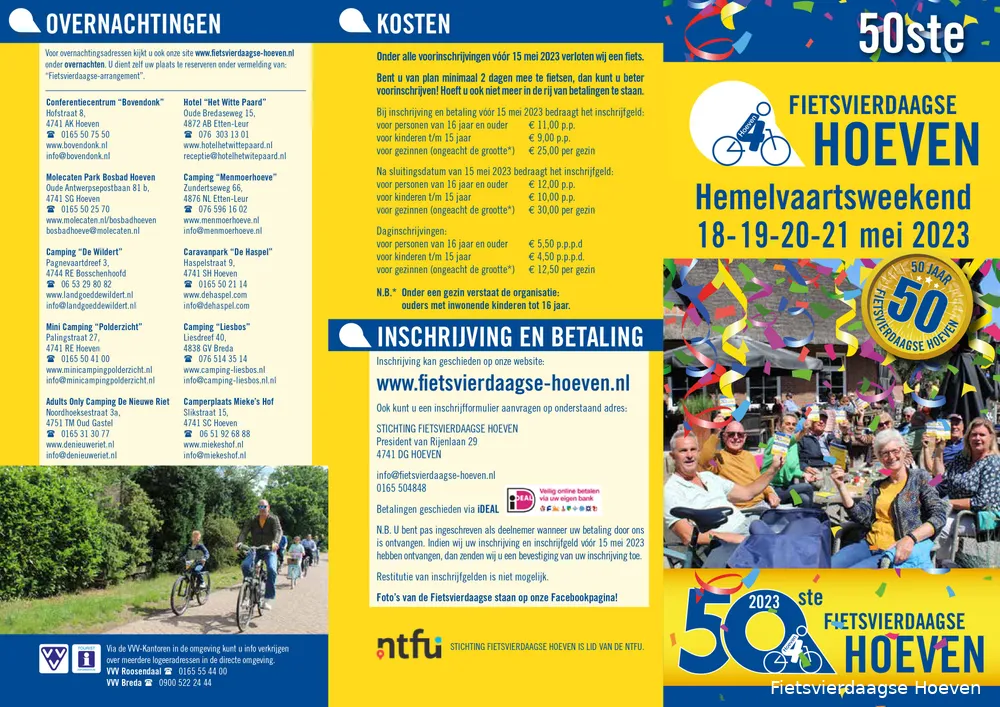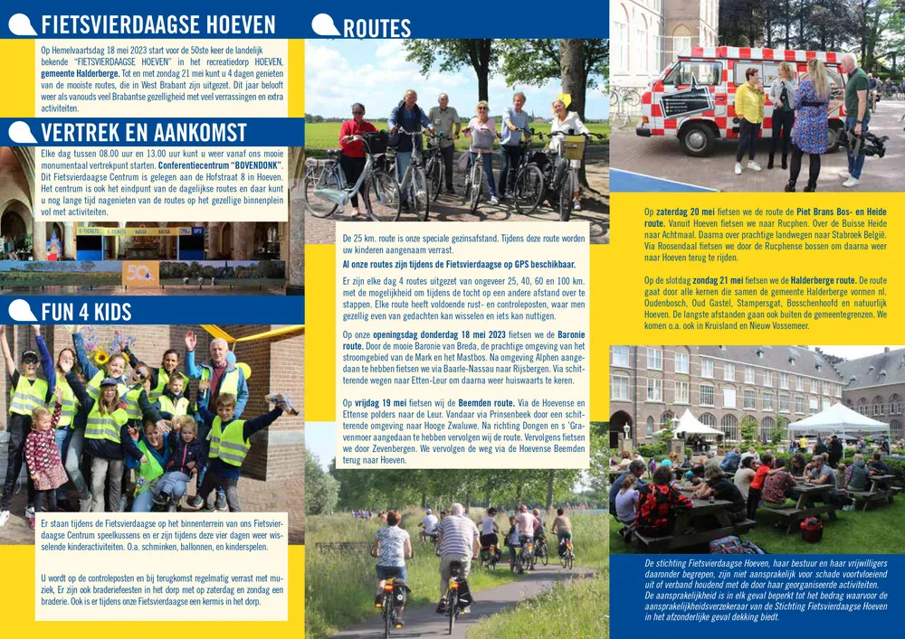 OpHemelvaartsdag 18 mei 2023start voor de50stekeer de landelijk bekendeFietsvierdaagse Hoeven in het recreatiedorpHoeven, gemeenteHalderberge. Tot en met zondag21 mei kunt u genieten van de mooiste routes die in West Brabant zijn uitgezet. We starten weer vanuit ons Fietsvierdaagse Centrum“Bovendonk”. Dit ligt in een zeer groene bosrijke omgeving. In de mooie binnenplaats van dit historische monumentale gebouw kunnen we weer heerlijk genieten bij de start van de fietstochten maar vooral bij terugkomst. De ambiance is er geweldig. Elke dag tussen 08.00 uur en 13.00 uur kunt u hier starten.