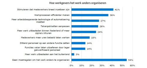 Iets minder dan de helft van de ondervraagde werkgevers zet in op het anders organiseren van werk. Maatregelen die zij nemen om het werk anders te organiseren zijn onder andere het stimuleren dat medewerkers breed inzetbaar zijn, werkprocessen efficiënter maken, takenpakketten aanpassen en meer arbeidsbesparende technologie of automatisering inzetten.